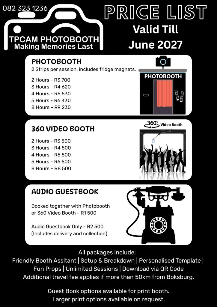 Prices include travelling within 50km from Boksburg. Further venues will be quoted on extra travel.